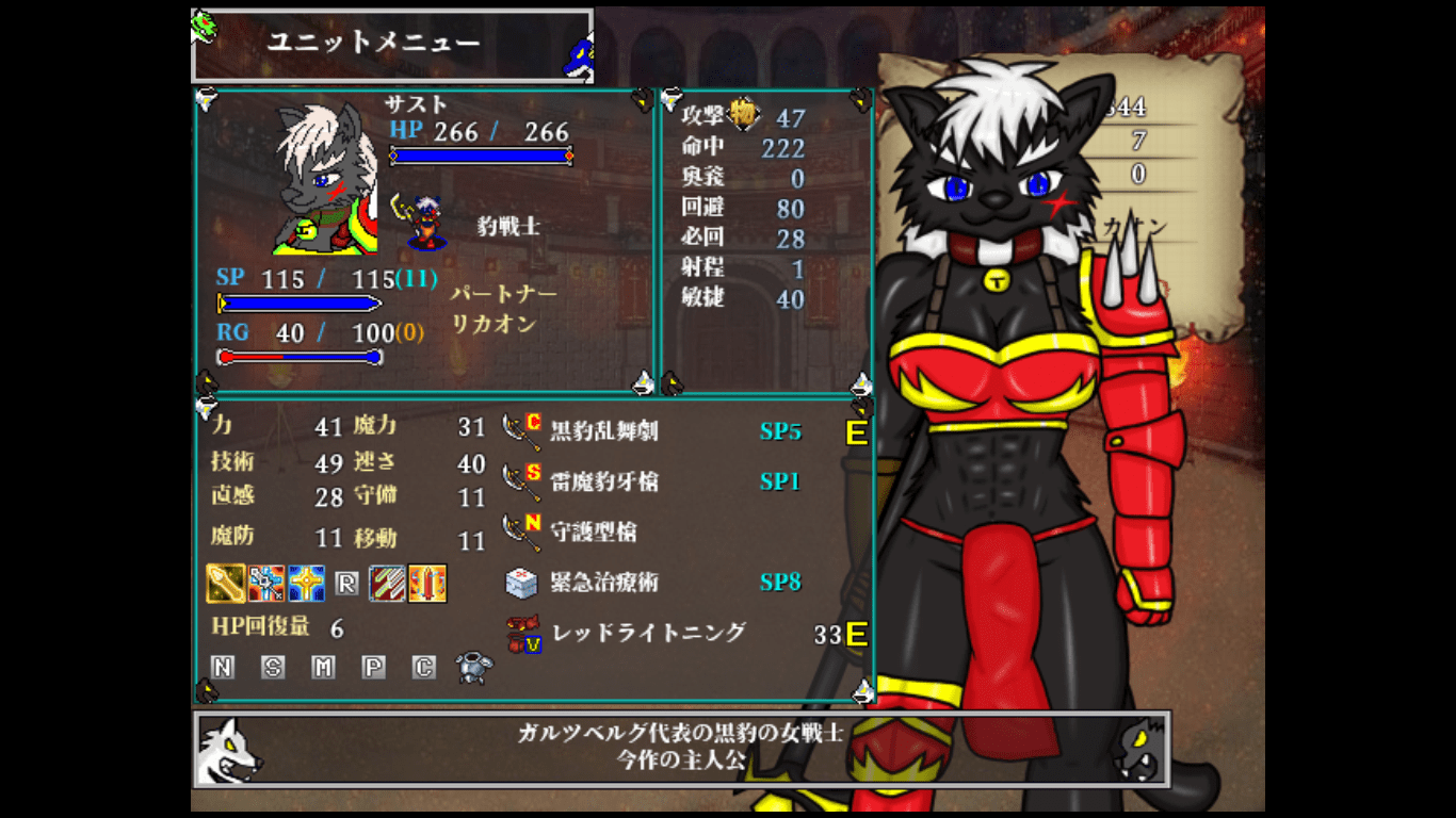 基本的に「ラッシュ」で厄介な「スリップストリーム」や「受け流し」を発動させずに蹴散らすスタイルは変わりません。初期装備から「黒豹臥撃」という「ラッシュブースト」を持つなかなかの技を所有しているため、序盤からラッシュで活躍できます。が、リャンフーに比べて打たれ弱いため、過信は禁物。