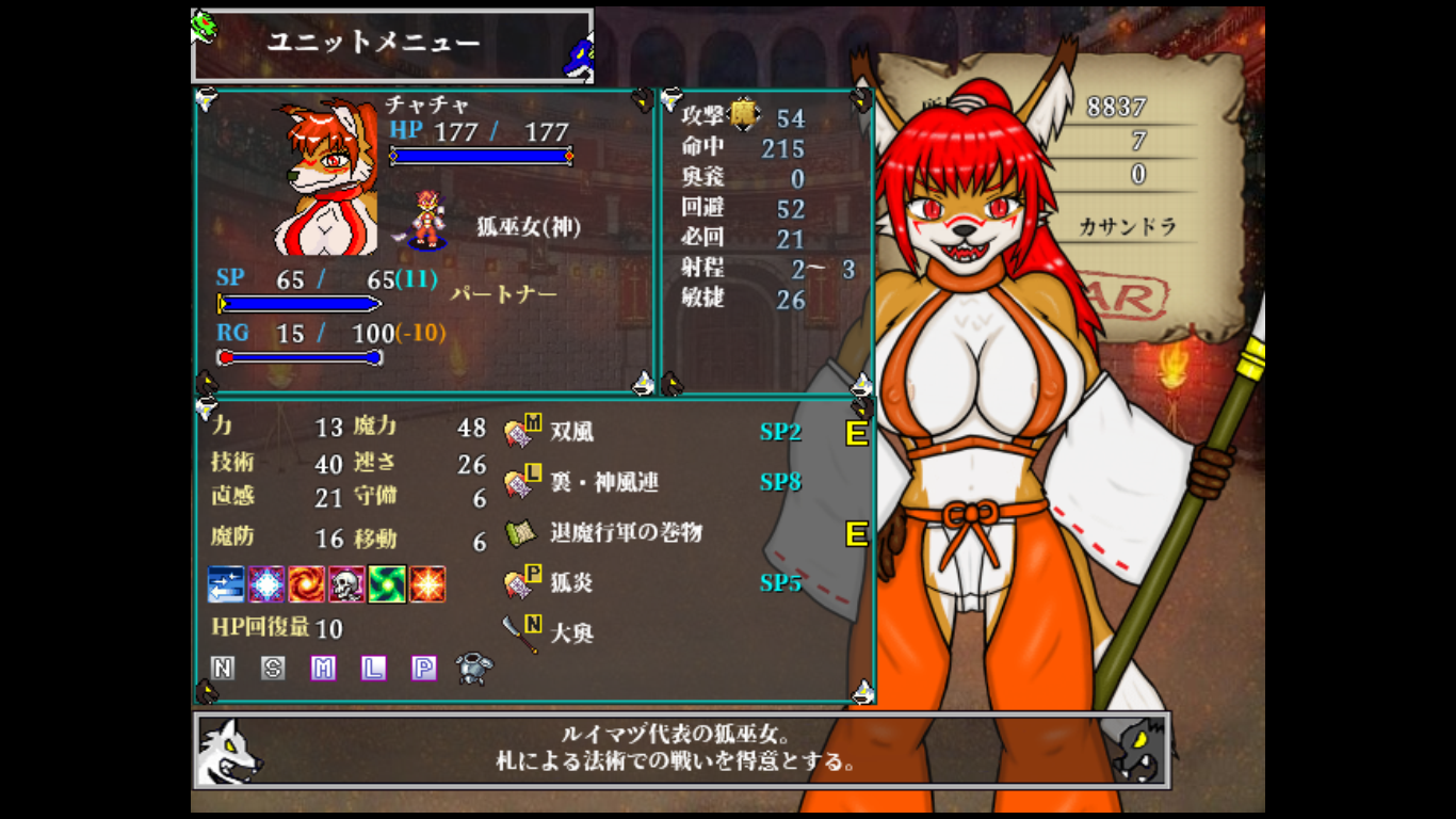 訓練に関してはいちいち文句言っては好感度を下げてくる&自主トレしない困った狐です。基本的な育成方針はタワー(集団訓練&非公式などの実戦で経験ポイントを稼ぎます。チャチャはタワーに関しては経験点も稼げるのでそこまで困らないでしょう。