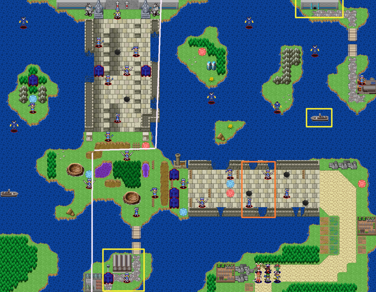 サストが一つ目の橋を越えた敵フェイズに橋が爆破されるイベントが発生し、魔法陣より右の三〼にいるキャラクターは戦闘不能かつその場所は海になってしまうので注意。移動力の低いエセルやゼオラなどは渡り切ってからサストが橋を越えるようにしよう。