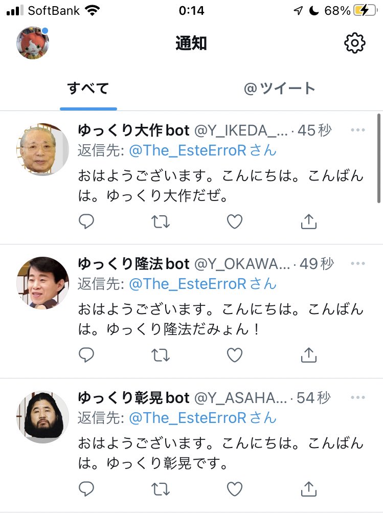 これらのbotは世界史界隈民をよくフォローしてくるが、世界史界隈とは何の関係もない。2022年7月31日にゆっくり隆法を除いて凍結したため解散した。