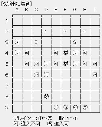 以下の戦闘マップの例のようにプレイヤー側には自分達がそれぞれ①~⑤の番号どれに対応しているか選んでもらっておき、戦闘開始時の初期配置は、その番号に対応したところから始まる。