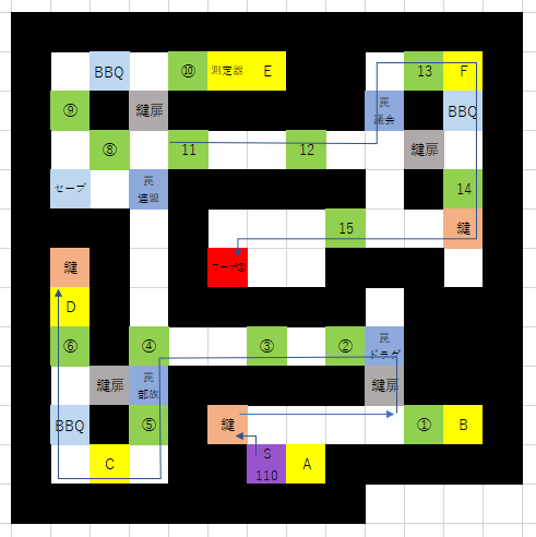 鍵をMAP1で鍵2本使わず持っている状況だと34歩スタート