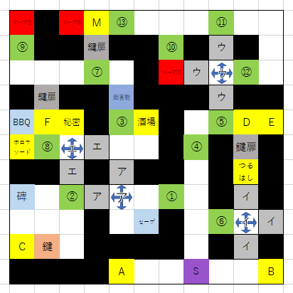 つるはしは「イ」の十字床を踏んで入手すること。(鍵を使わない)