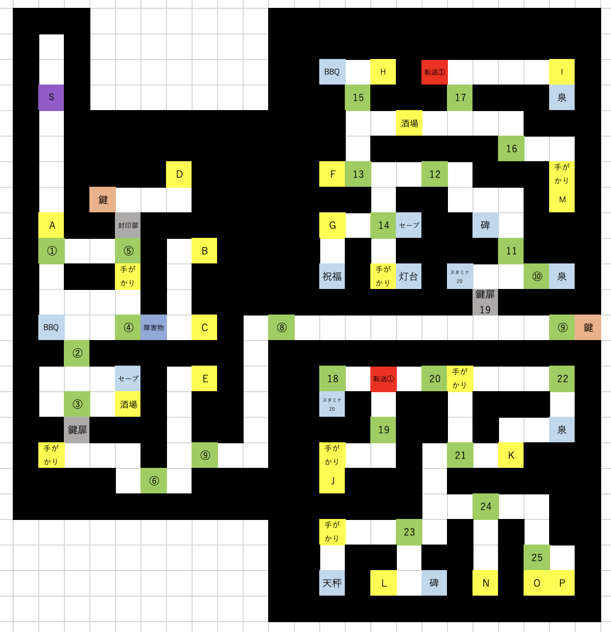 宝箱H(BBQ無視)→16→手がかり、宝箱M→17→転送ゲート