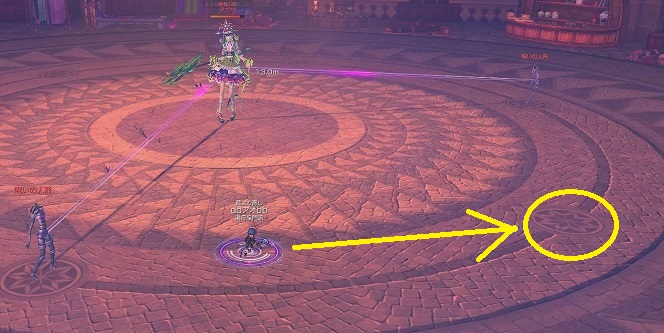 また白丸の位置など、ずれて立ってしまうと範囲が曲がって出てしまって安置が狭くなってしまうのでなるべく床の丸模様に立ち。黒丸の方向に向かって移動する