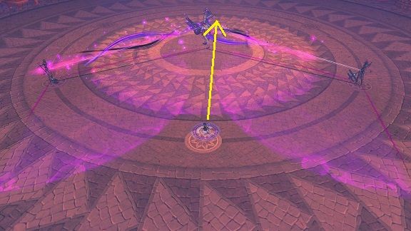 雑魚人形出現の場所はボスから13Mほどの場所にある床の丸模様の場所2箇所、丸模様は12、2、4、6、8、10時の場所にあり、雑魚は12、8や2、6時など1個模様を飛ばした状態で出現する、注視者はこの時1個飛ばされた丸模様の場所に立ち範囲を誘導する、上記の12,8なら10時、2,6なら4時の模様