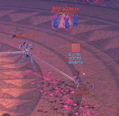 遠距離注視選択者に雑魚人形2匹とボスからの120度範囲攻撃