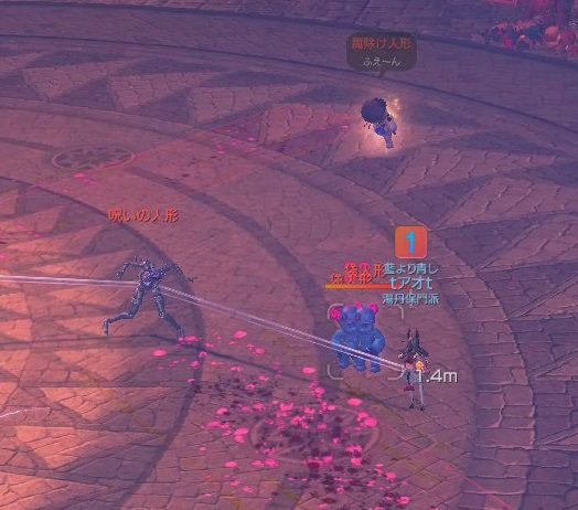 強制的に人形役が位置を移動させられ、動けなくなったたあと、頭の上にカウントが付いた雑魚人形が数匹集まってくる、この雑魚人形はカウント0で爆発する、ダメージなどはない、この雑魚人形に打ち上げを行い、人形役の頭の上のものを雑魚人形の爆発で壊すことで人形役が動けるようになる、ボスから10M以内で1を押したらギミック終了