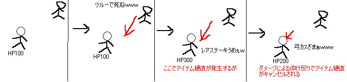 1.敵の、おそらく回避不能であろう攻撃を確認する(ライト・スピア・ツルー・イーグルや氷結時のヘルなど) 2.被弾直前に回復アイテムを使う 3.アイテム硬直がダメージの仰け反りによってキャンセルされる