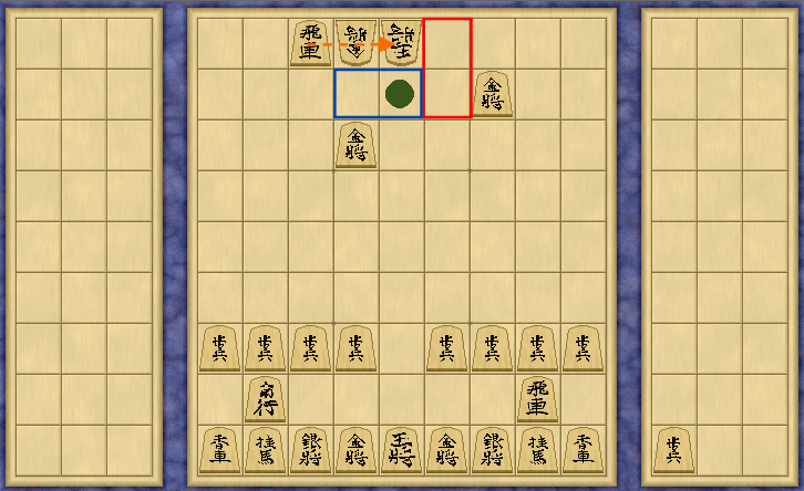 飛車(7一)の横利きがあるため、敵の金将は5二の地点に打たれた歩兵を取れません。